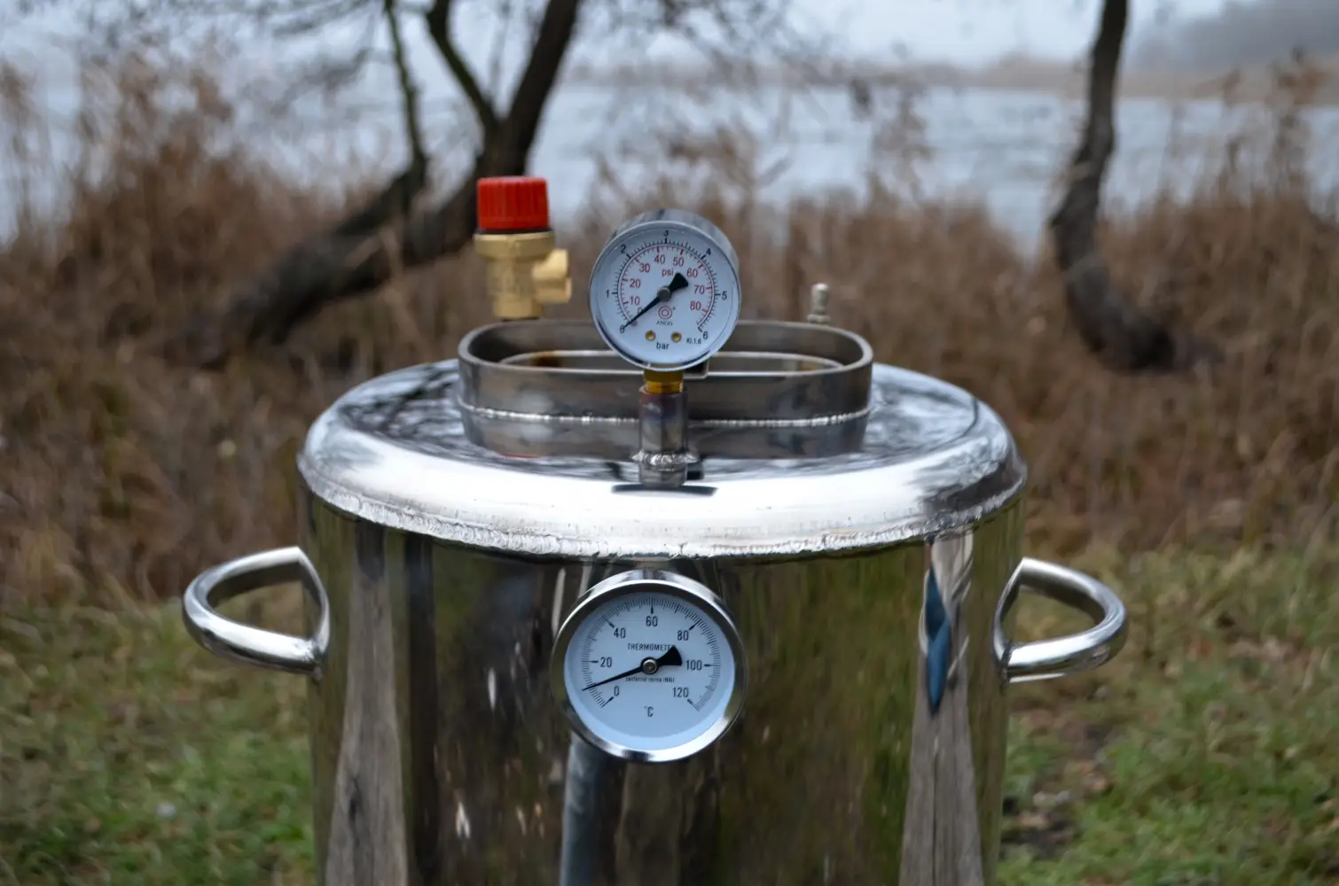 термометр биметаллический, манометр, клапан безопасности, штуцер для нагнетания давления, пластиковый кабельный ввод (сальник), твердый нагревательный элемент THERMOWATT, терморегулятор с сетевым шнуром, подставки под банки, прокладка из пищевого силикона