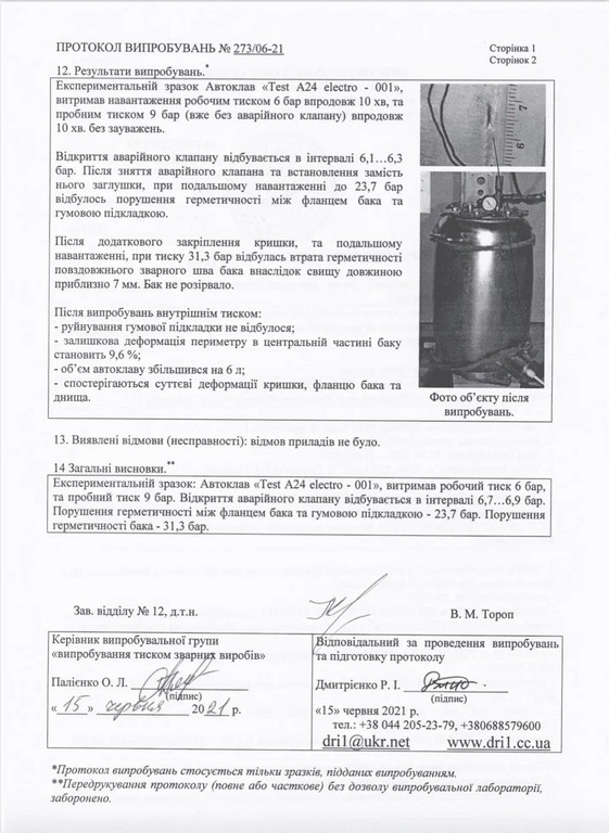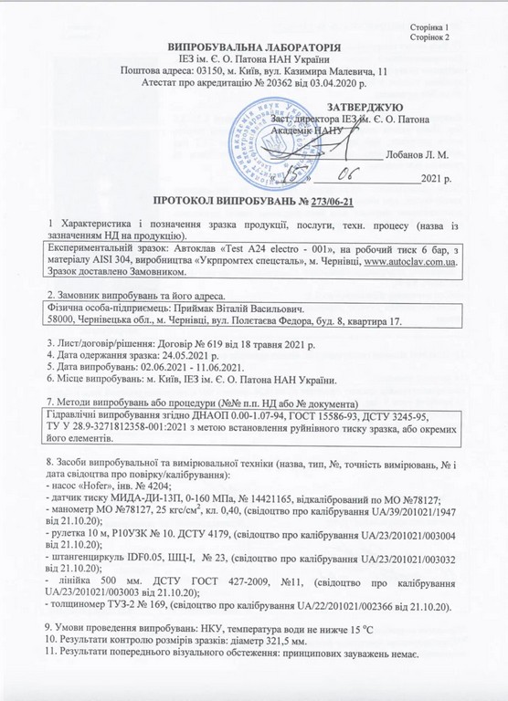 Автоклавы производителя УКРПРОМТЕХ проходят тестирование в 2 этапа при экстремальных нагрузках для выявления бракованных изделий и их недопущения на рынок сбыта.