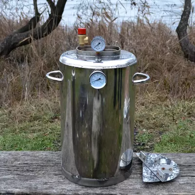 термометр биметаллический, манометр , клапан безопасности, штуцер для нагнетания давления, прокладка из пищевого силикона, подставка под банки, книга рецептов, инструкция с гарантией