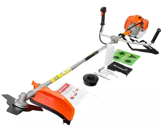 - Універсальність мотокосі надає комплект косильних комплектуючих - напівавтоматична котушка з ліскою + диск. Корд здійснює акуратну стрижку трав'янистих рослин із м'якими стеблами смугою 440 мм; для зрізу жорстких пагонів бур'янів, порослі дерев та чагарника передбачений пиляльний ніж діаметром 26 см.