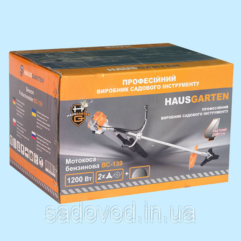 Бензиновий триммер "Hausgarten", BC-139 має подвійну конструкцію камери поглинання шуму для тихої роботи. Двигун є наближеною копією двигуна бензотримера Honda.