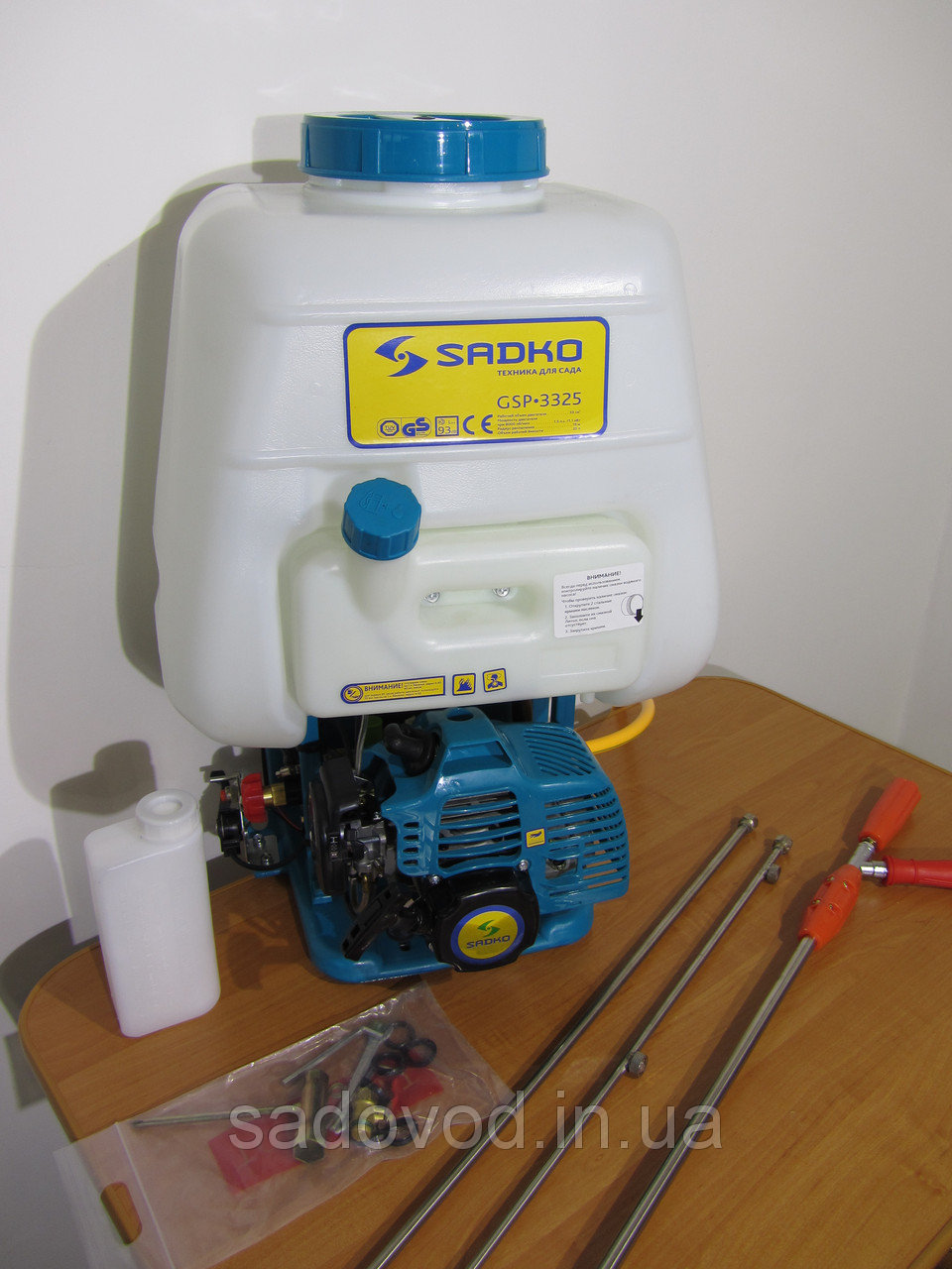 - Когось може відштовхувати в 2-тактному двигуні, необхідність змішувати бензин з маслом, проте не варто і хвилюватися про це, тому що виробник, компанія Садко, комплектує обприскувач спеціальною пляшкою з мірками, за допомогою якої Ви легко зможете приготувати паливну суміш. При цьому обсяг пляшки відповідає обсягу паливного бака, що додає ще більшої зручності.