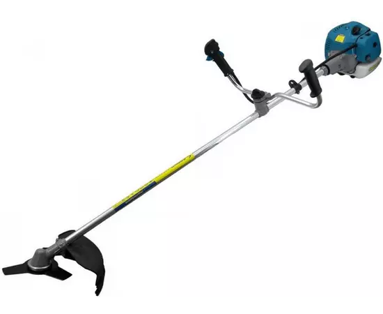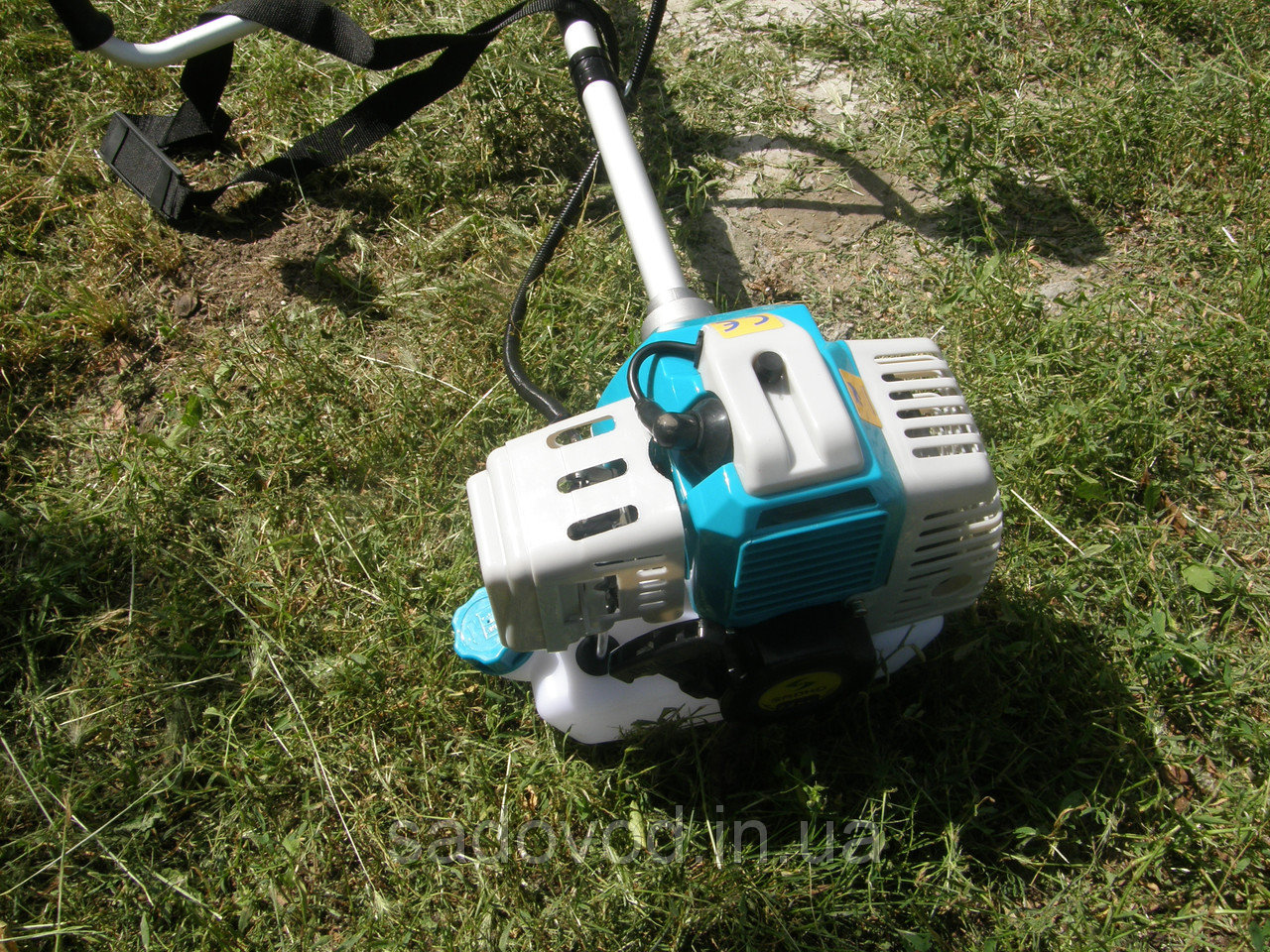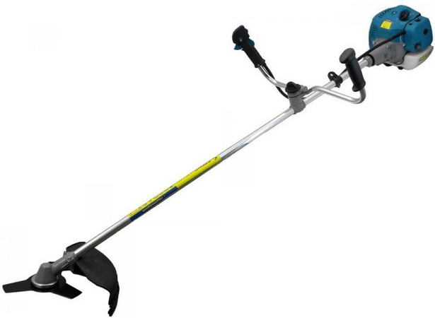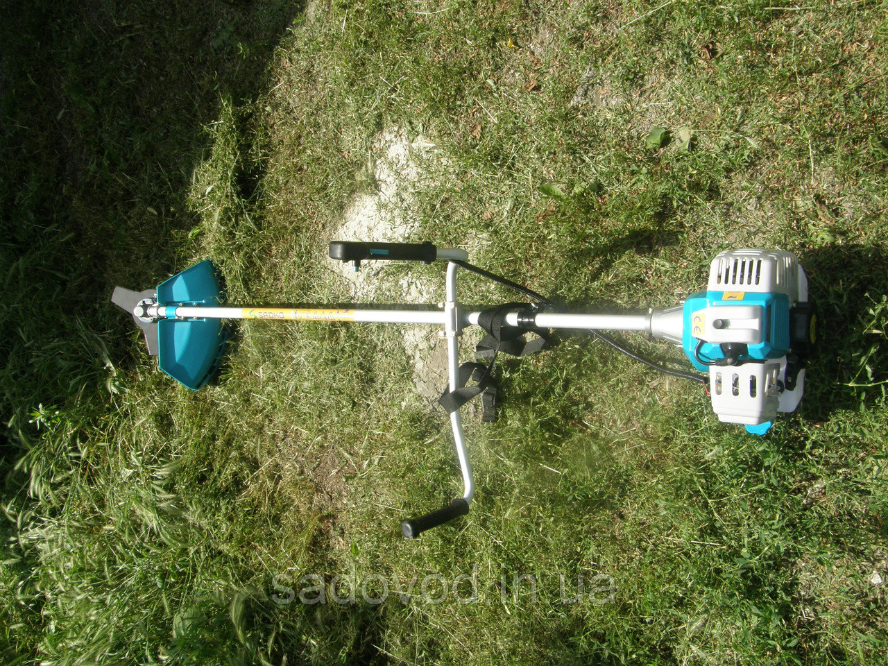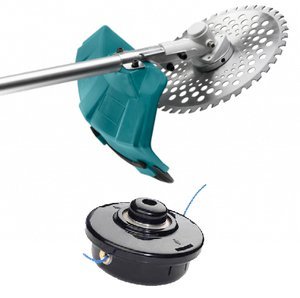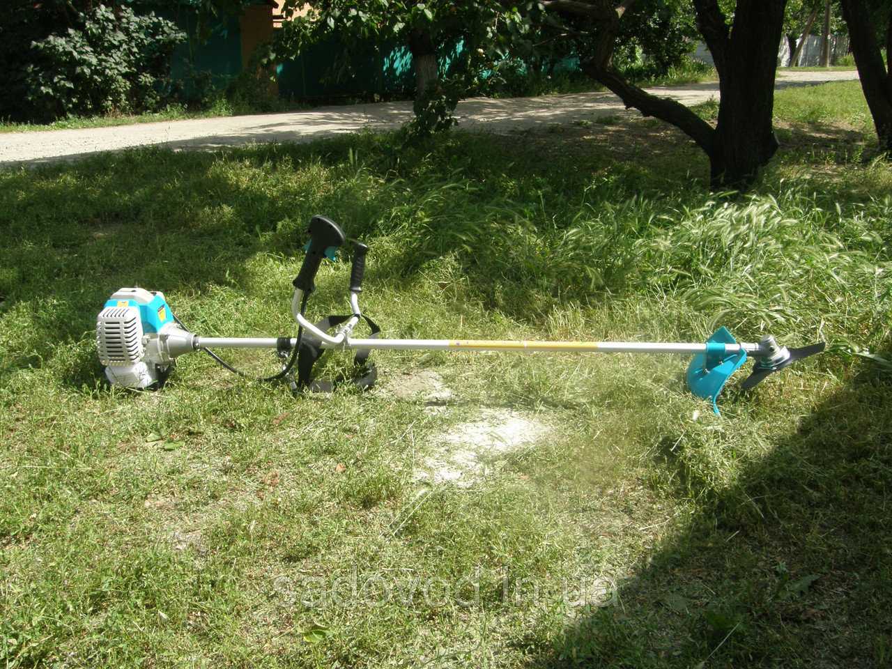 - Два режущих инструмента: 3х лепестковый нож из металла, а также нейлоновая катушка с леской толщиной в 2 мм. Леска косит на ширину в 44 см, нож срезает сухие и плотные сорняки, проходя по 25 см за 1 оборот.