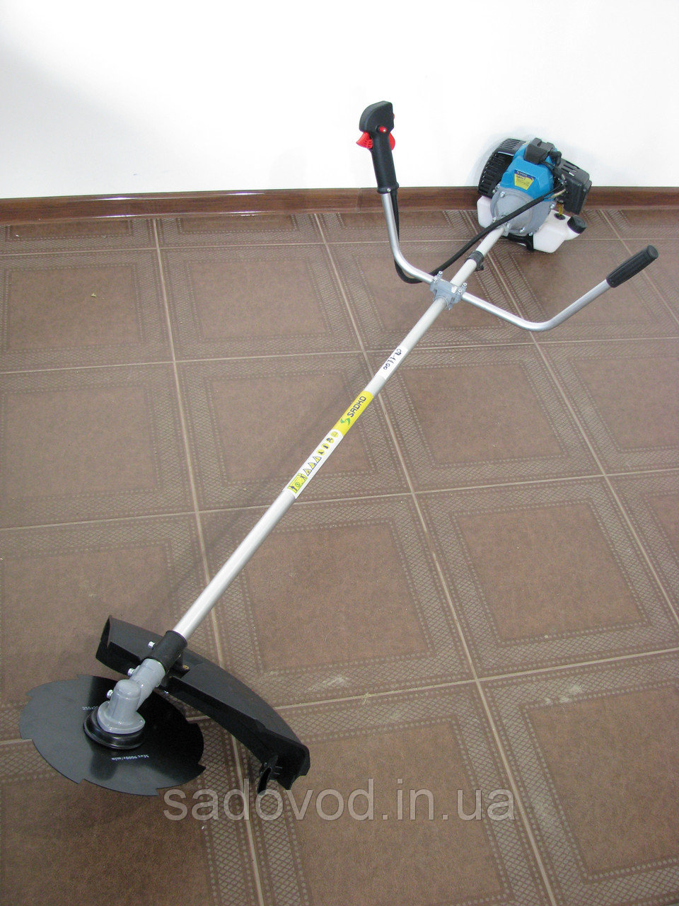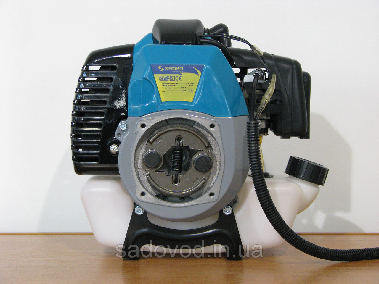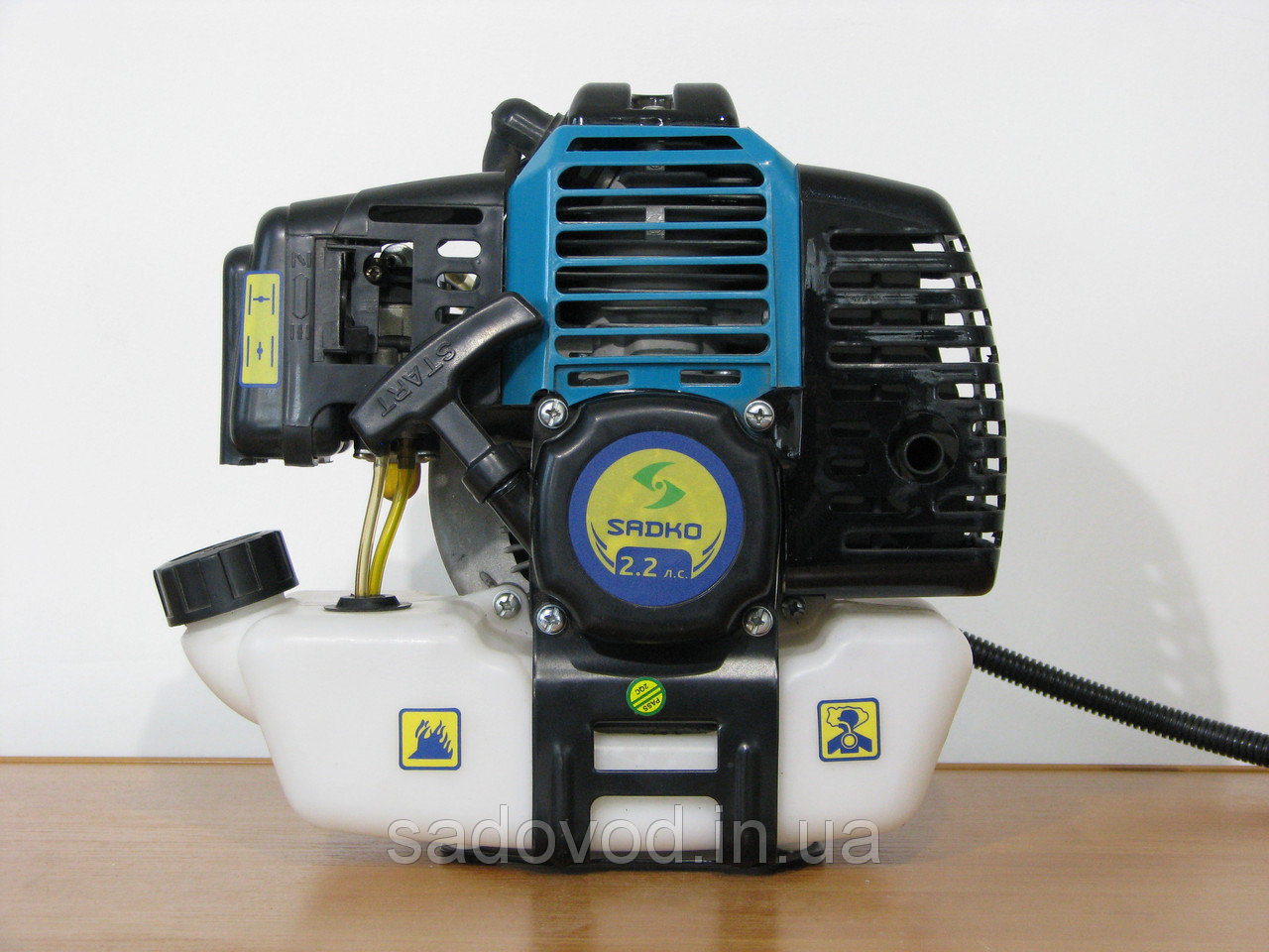 На мотокосе Sаdko GTR-2200 установлен двигатель мощностью 2.2 л.с. Этой мощности достаточно для покоса толстой травы, сорняков, с диском можно косить поросль деревьев.