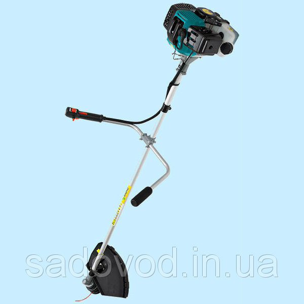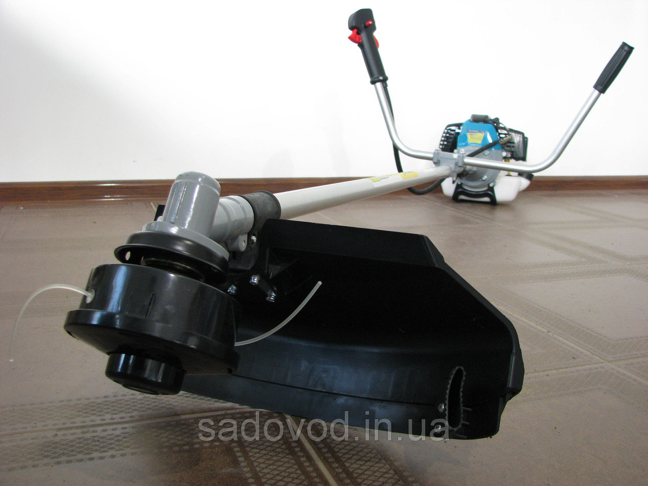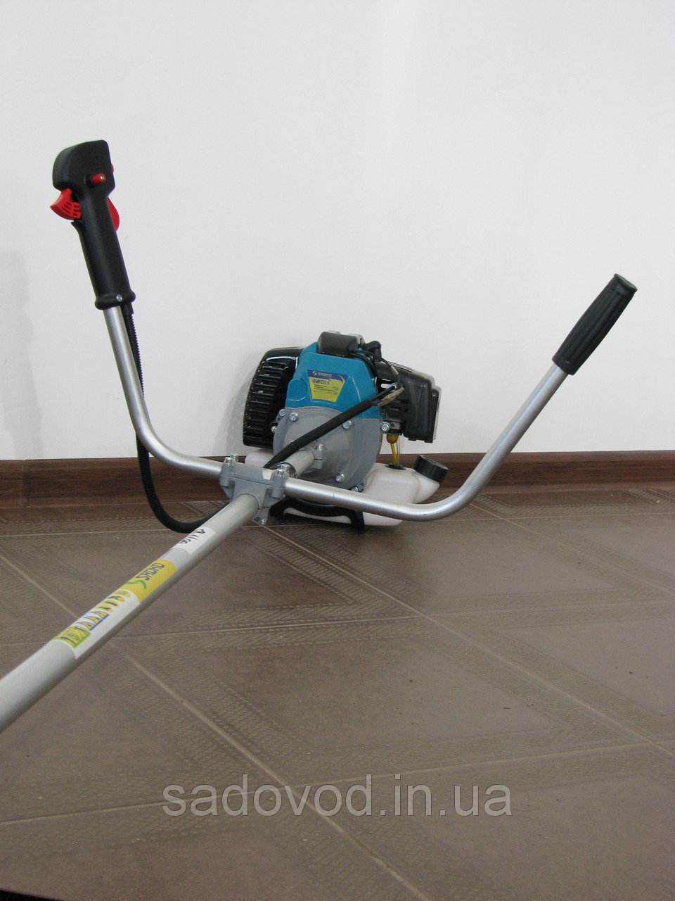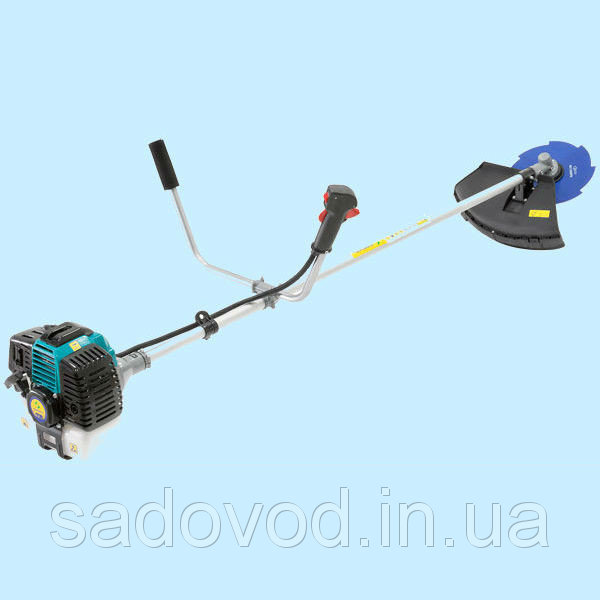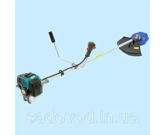 На мотокосе Sаdko GTR-2200 установлен двигатель мощностью 2.2 л.с. Этой мощности достаточно для покоса толстой травы, сорняков, с диском можно косить поросль деревьев.