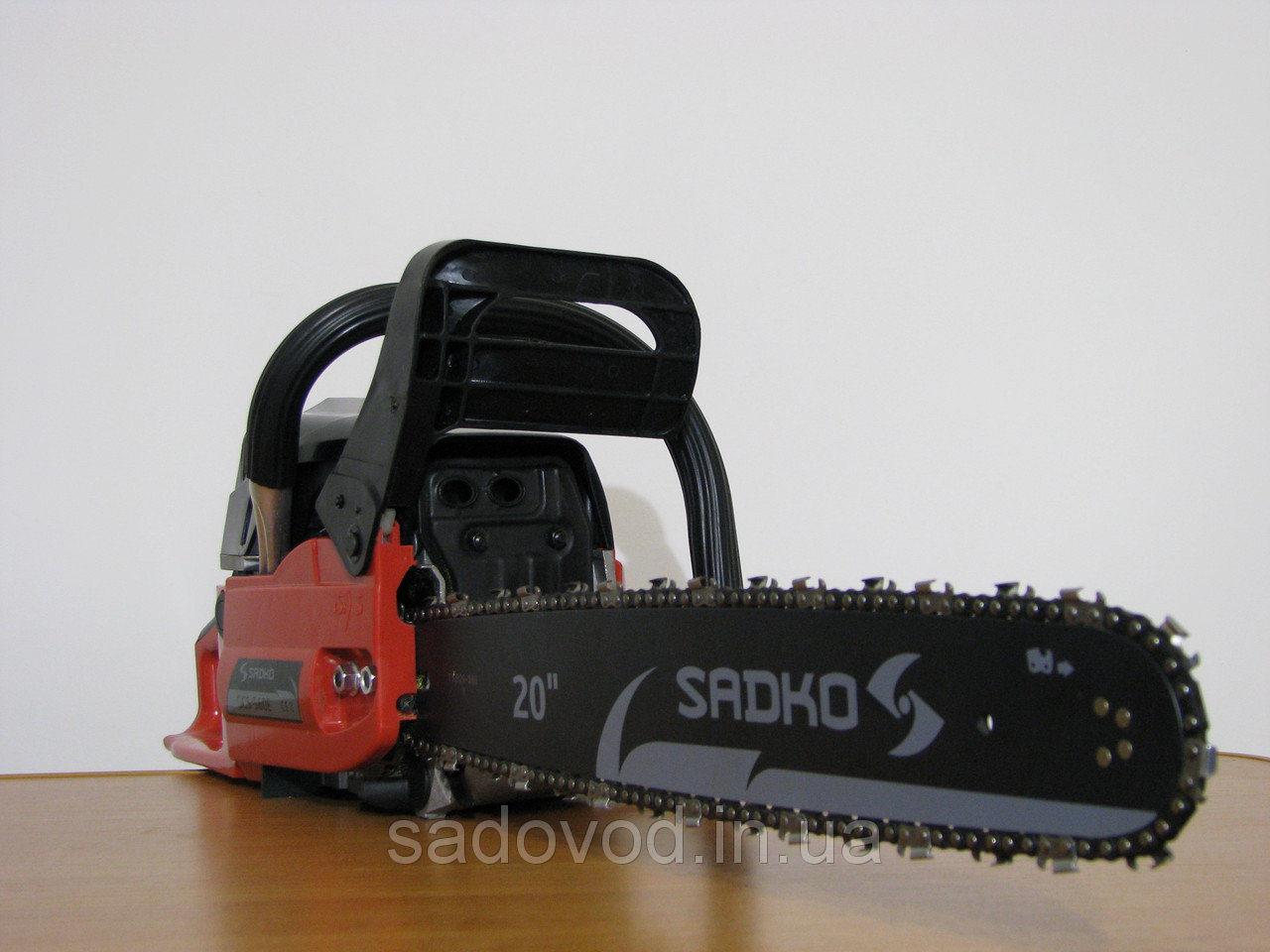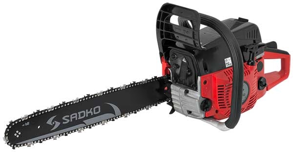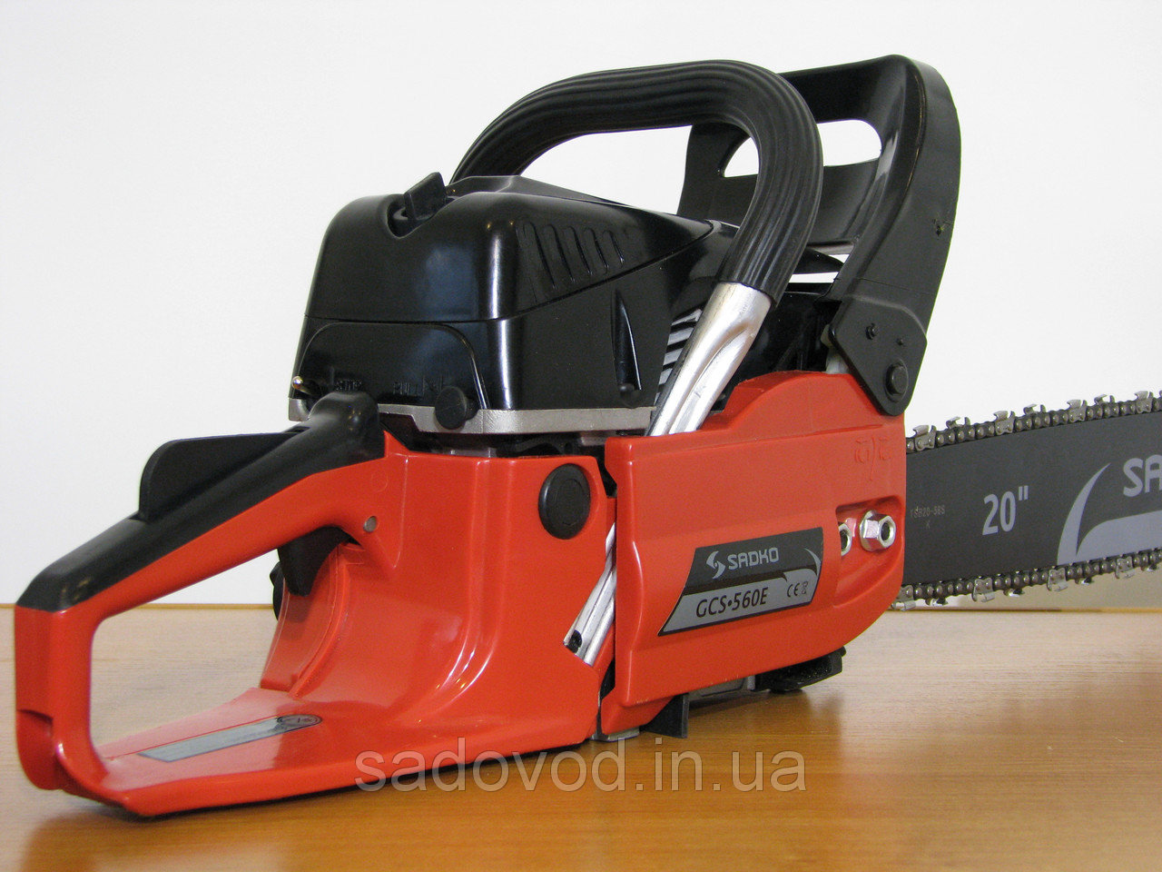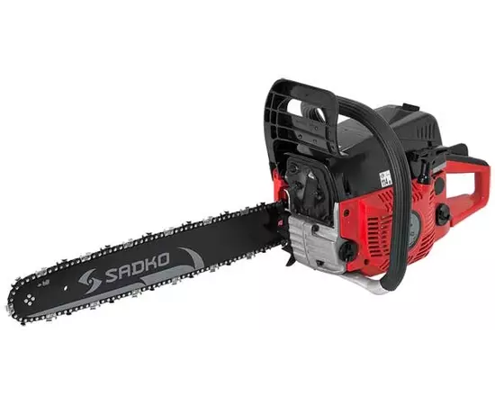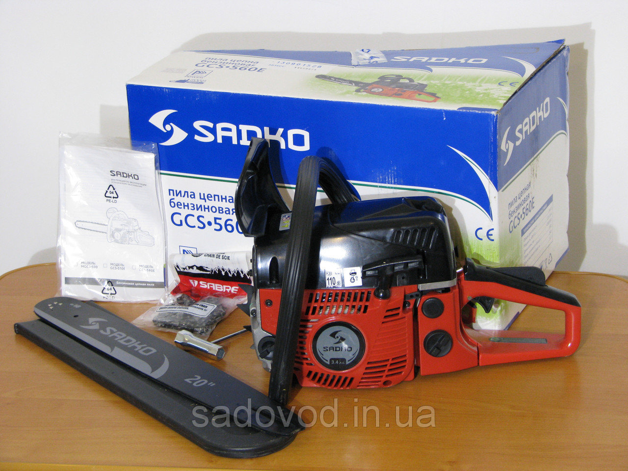 - Цепная бензиновая пила Sadko GCS-560E комплектуется мощным двигателем (3,4 л.с.) и шиной 50 см (20 дюймов). Такая мощь и длина шины позволит валить даже самые большие деревья (теоретически до 1 метра в диаметре!).