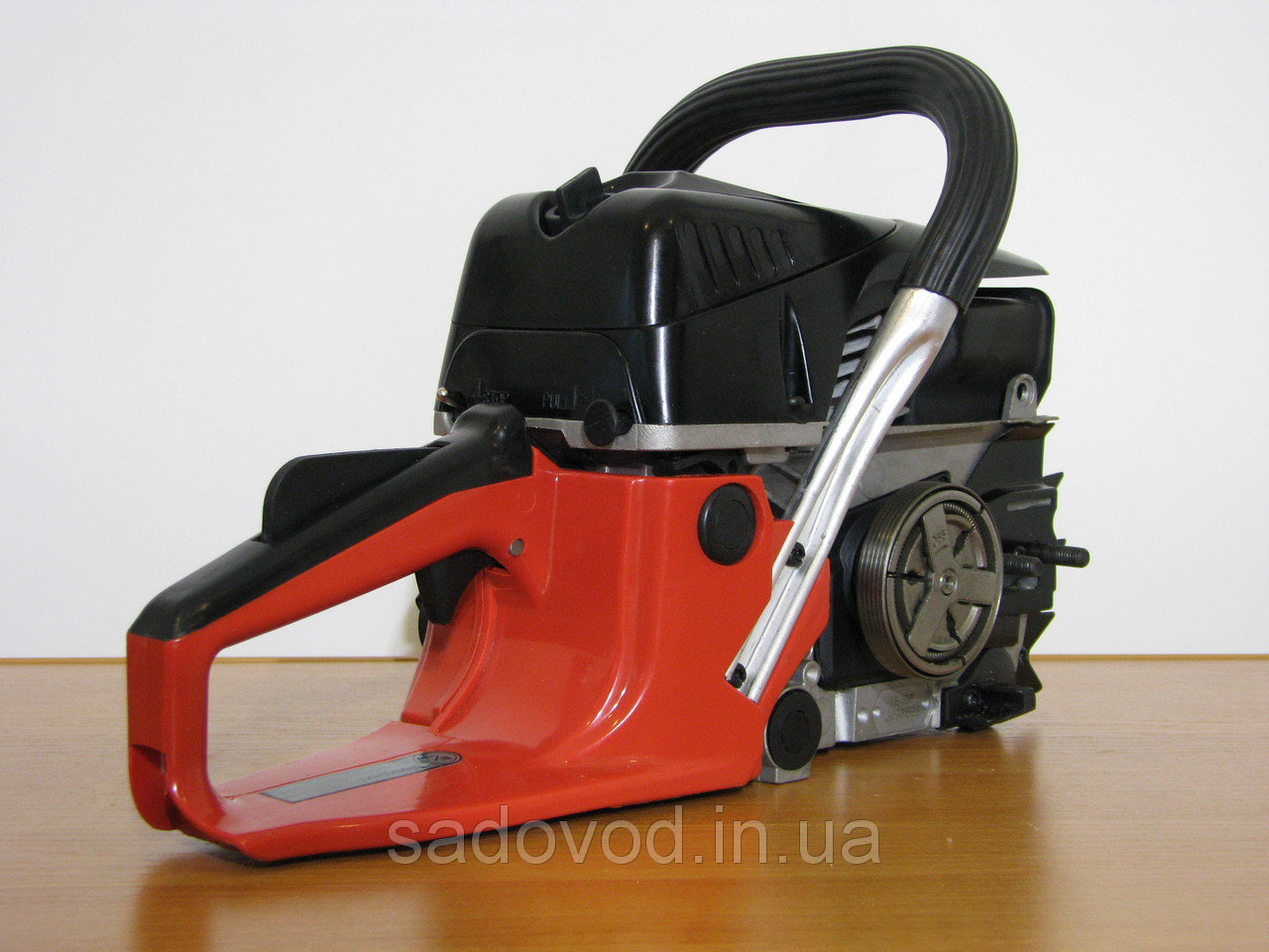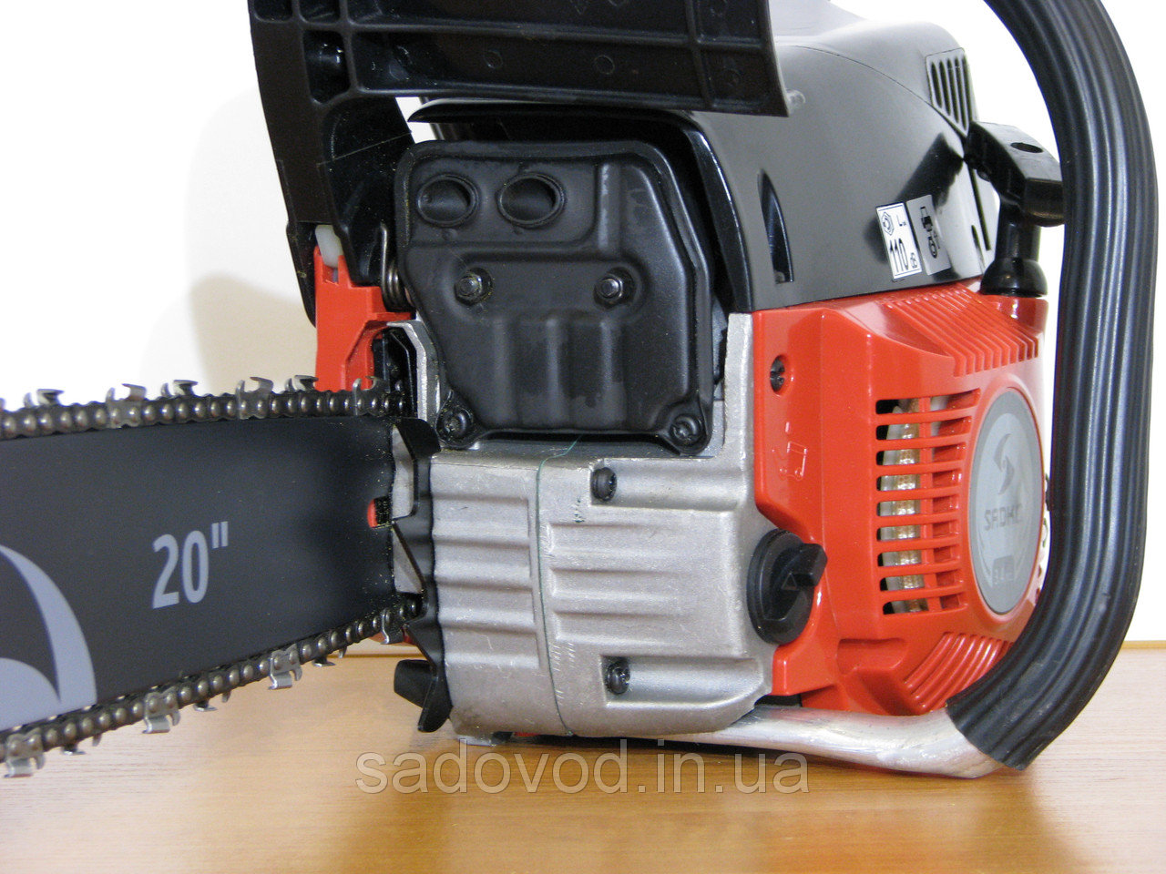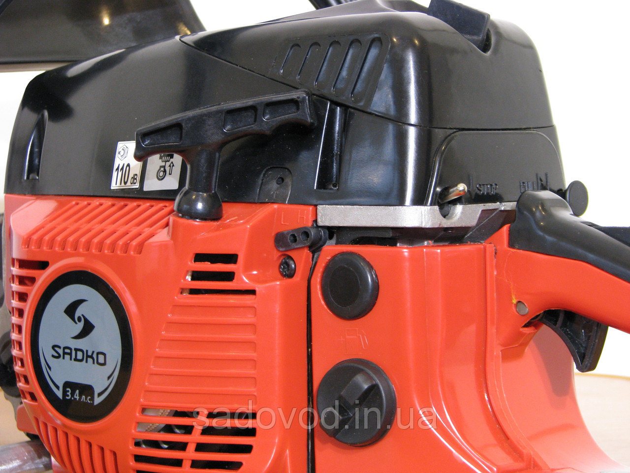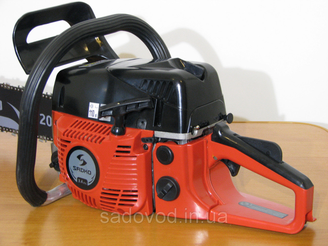 - Цепная бензиновая пила Sadko GCS-560E комплектуется мощным двигателем (3,4 л.с.) и шиной 50 см (20 дюймов). Такая мощь и длина шины позволит валить даже самые большие деревья (теоретически до 1 метра в диаметре!).