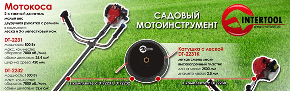 Конструкцией устройства Intertool DT-2232 предусматривается использование в качестве режущего инструмента полуавтоматической триммерной головки с леской и трехлопастного ножа. При ширине скашивания 230 мм. при помощи ножа, и 420 мм. леской мотокоса Интертул DT-2232 быстро справится с операциями по скашиванию травы, сорной растительности и мелкого кустарника.