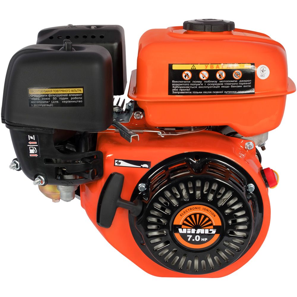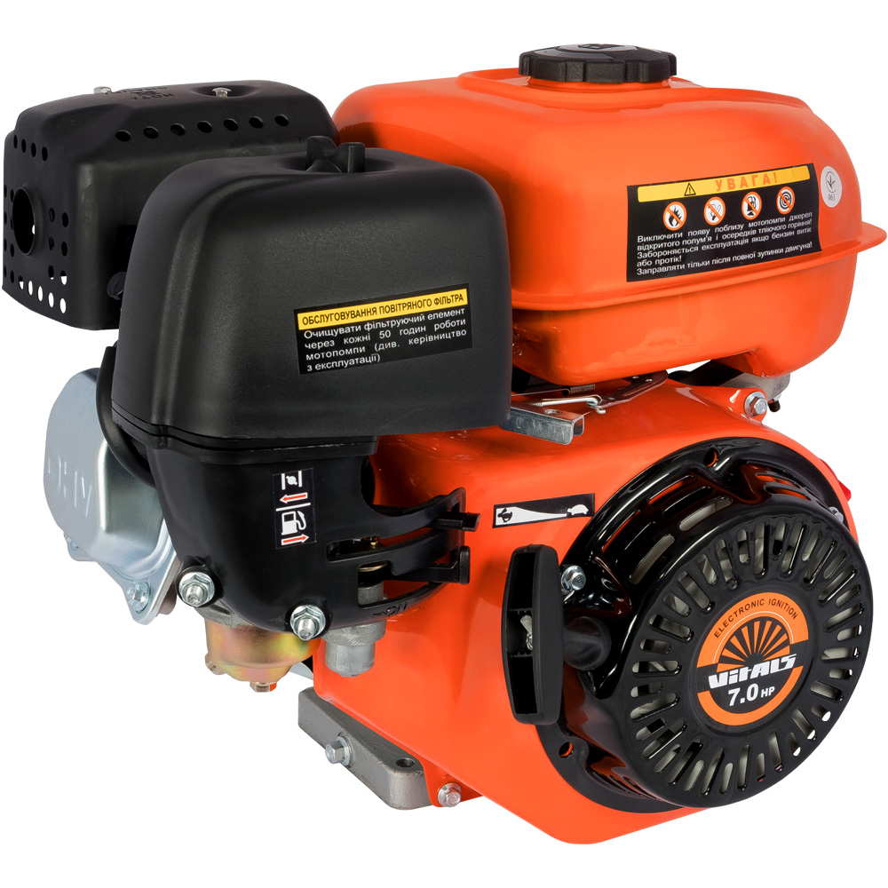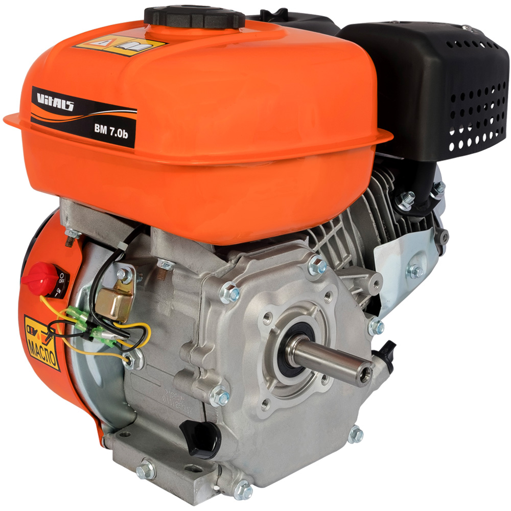 Четырехтактный одноцилиндровый мотор Vitals объемом 212 куб.см. запускается при помощи ручного стартера и оборудован дискретным датчиком масла, обеспечивающим двигателю защиту при низком уровне или отсутствии масла в картере.