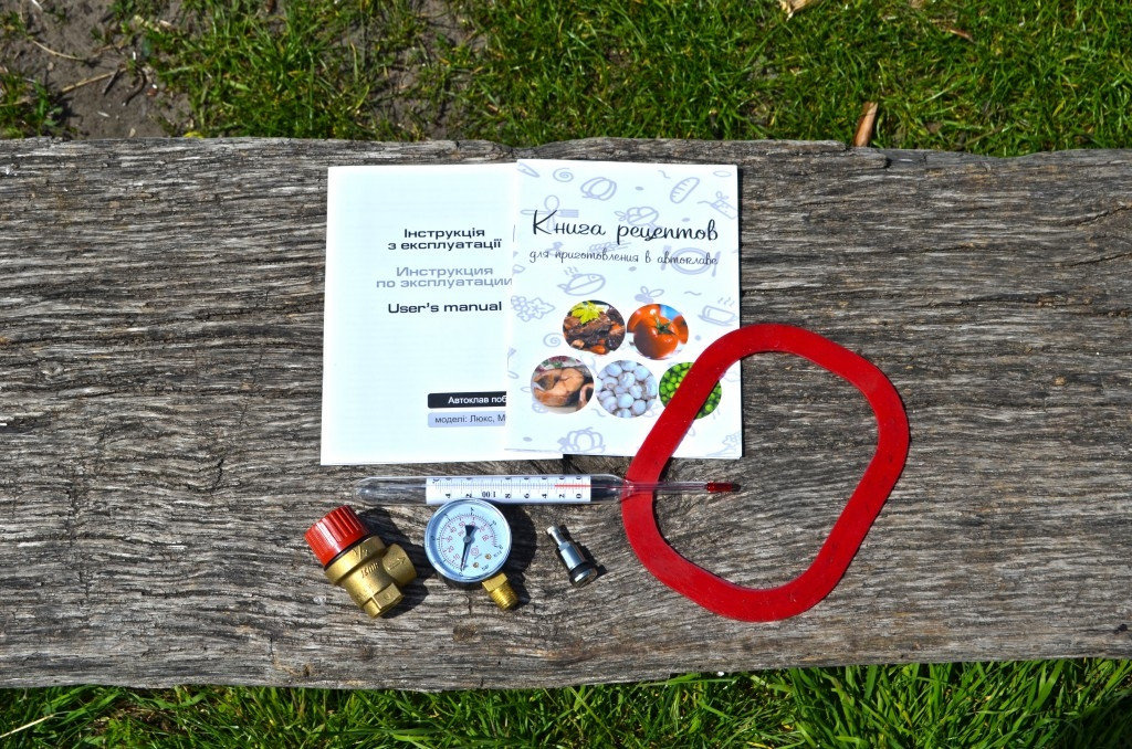 Автоклав, запобіжний клапан, термометр, манометр, штуцер для підкачування повітря, силіконова прокладка, книга рецептів, інструкція, гарантійний талон