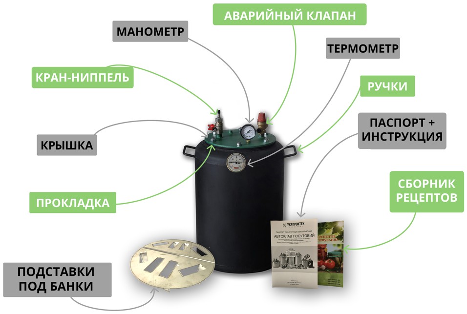 Автоклав, аварийный клапан, термометр, манометр, кран-ниппель, терморегулятор, паспорт-инструкция, книга рецептов, гарантийный талон.