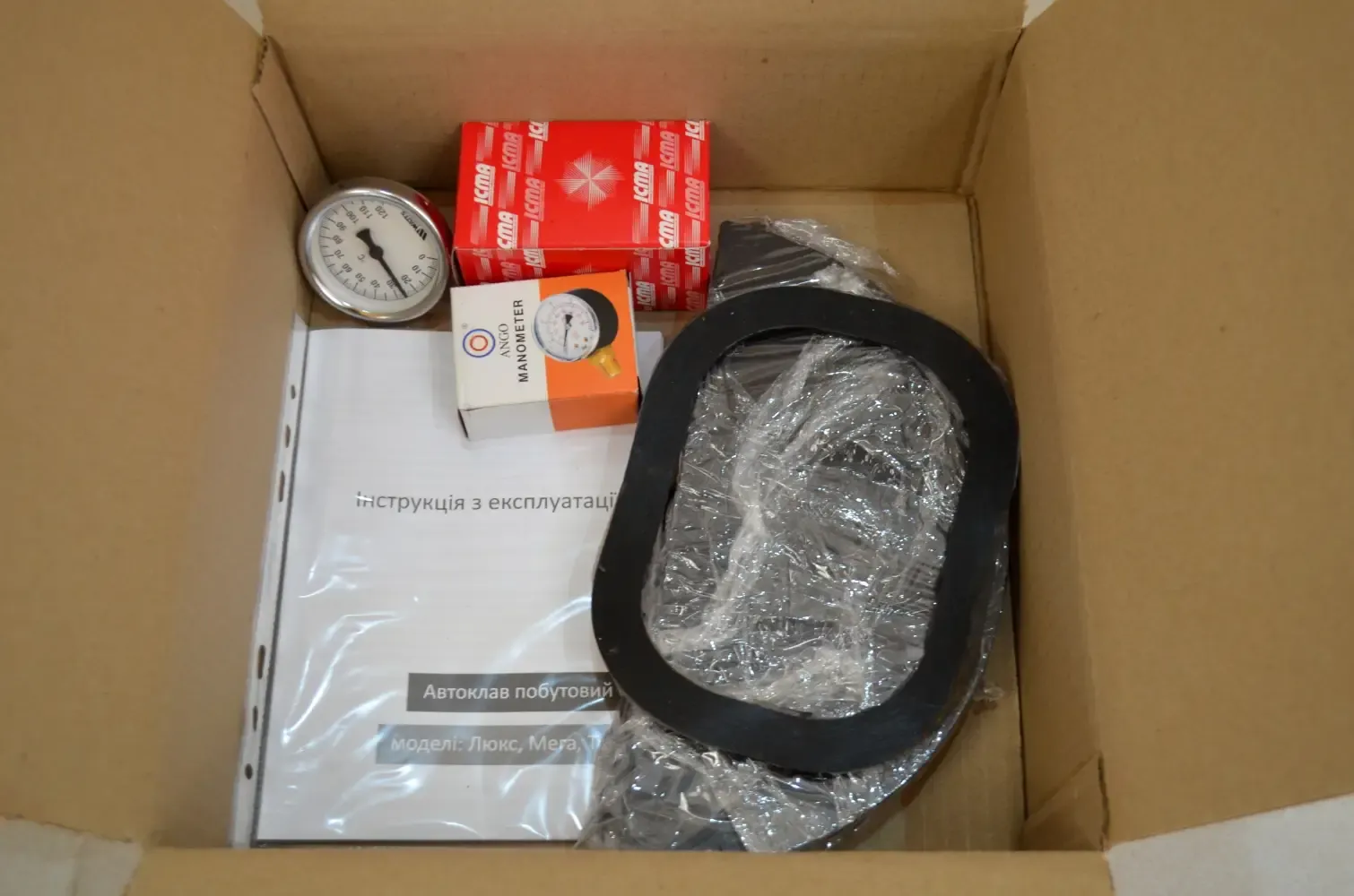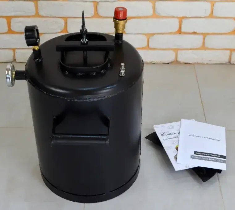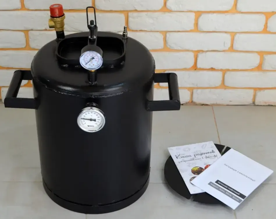 Автоклав, запобіжний клапан, термометр, манометр, штуцер для підкачування повітря, силіконова прокладка, книга рецептів, інструкція, гарантійний талон