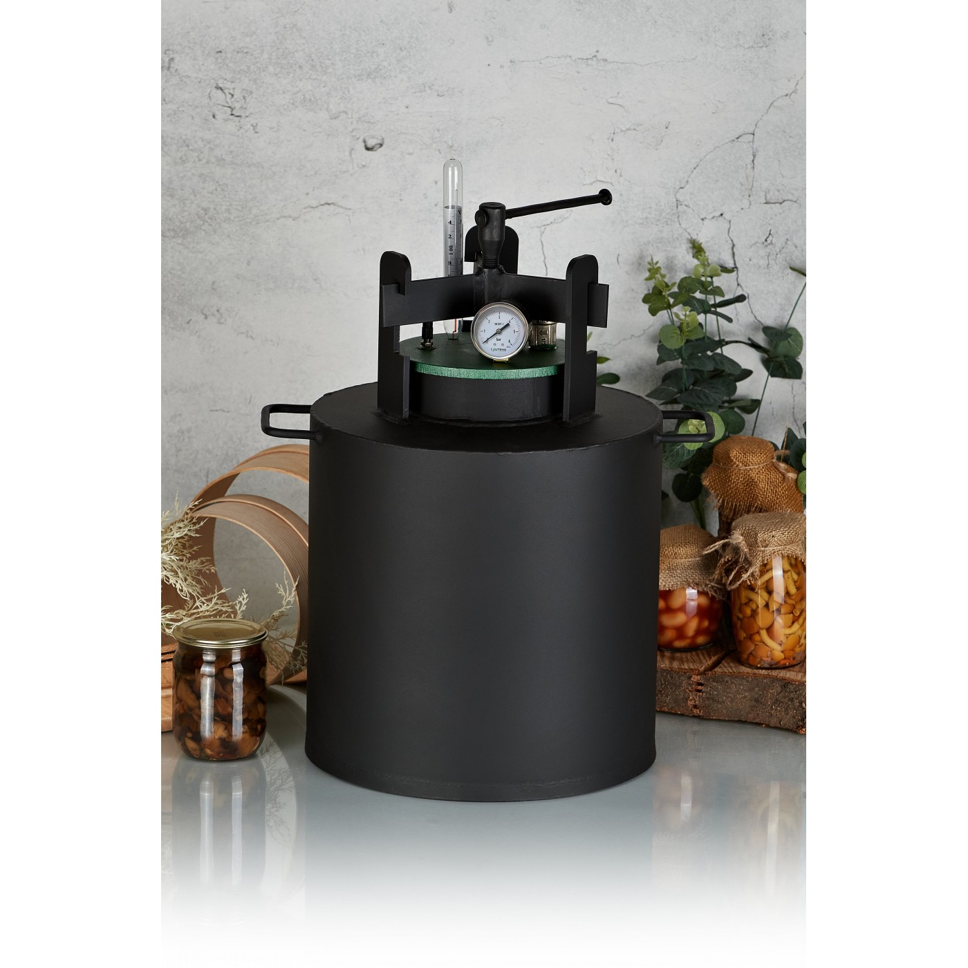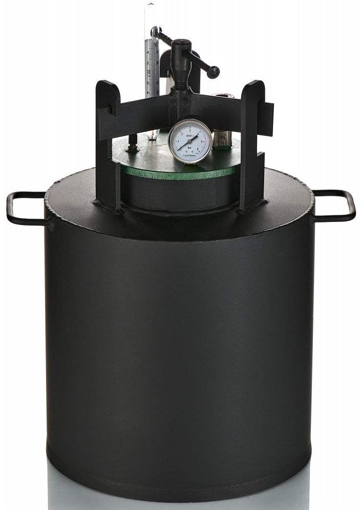 Автоклав нагревается от внешнего источника тепла, что дает ему независимость от электросети, если вдруг электричество пропадет, процесс приготовления останавливать не придется. Автоклав довольно компактный и удобный в эксплуатации. Камера стерилизации вмещает 16 банок объемом 0.5 литра, а так же банки объемом 1 и 2 литра. Агрегат оснащен аварийным клапаном, что гарантирует безопасный процесс консервирования.