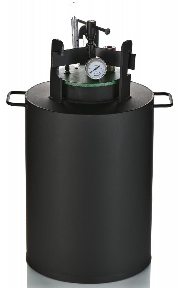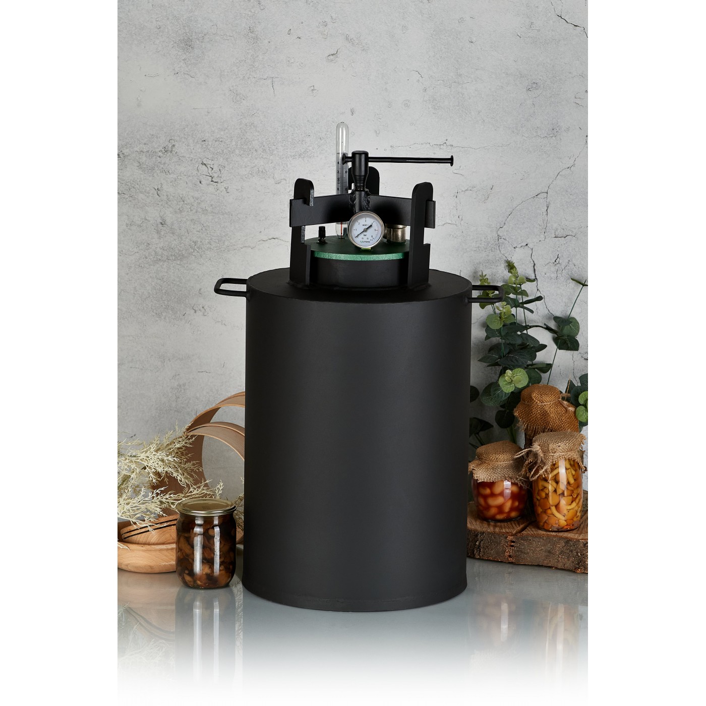 Агрегат изготовлен из прочной, черной, стали, что помимо качества придает аппарату эстетичный внешний вид. Автоклав нагревается от внешнего источника тепла, что дает возможность использовать его там, где есть проблемы с электроснабжением. Вместимость камеры консервирования на 24 полулитровых банки, позволяет сделать за одну загрузку много заготовок. Помимо качества сварочных швов, полной герметичности и продуманной конструкции, безопасность во время консервирования гарантируется аварийным клапаном, которым оснащен автоклав.