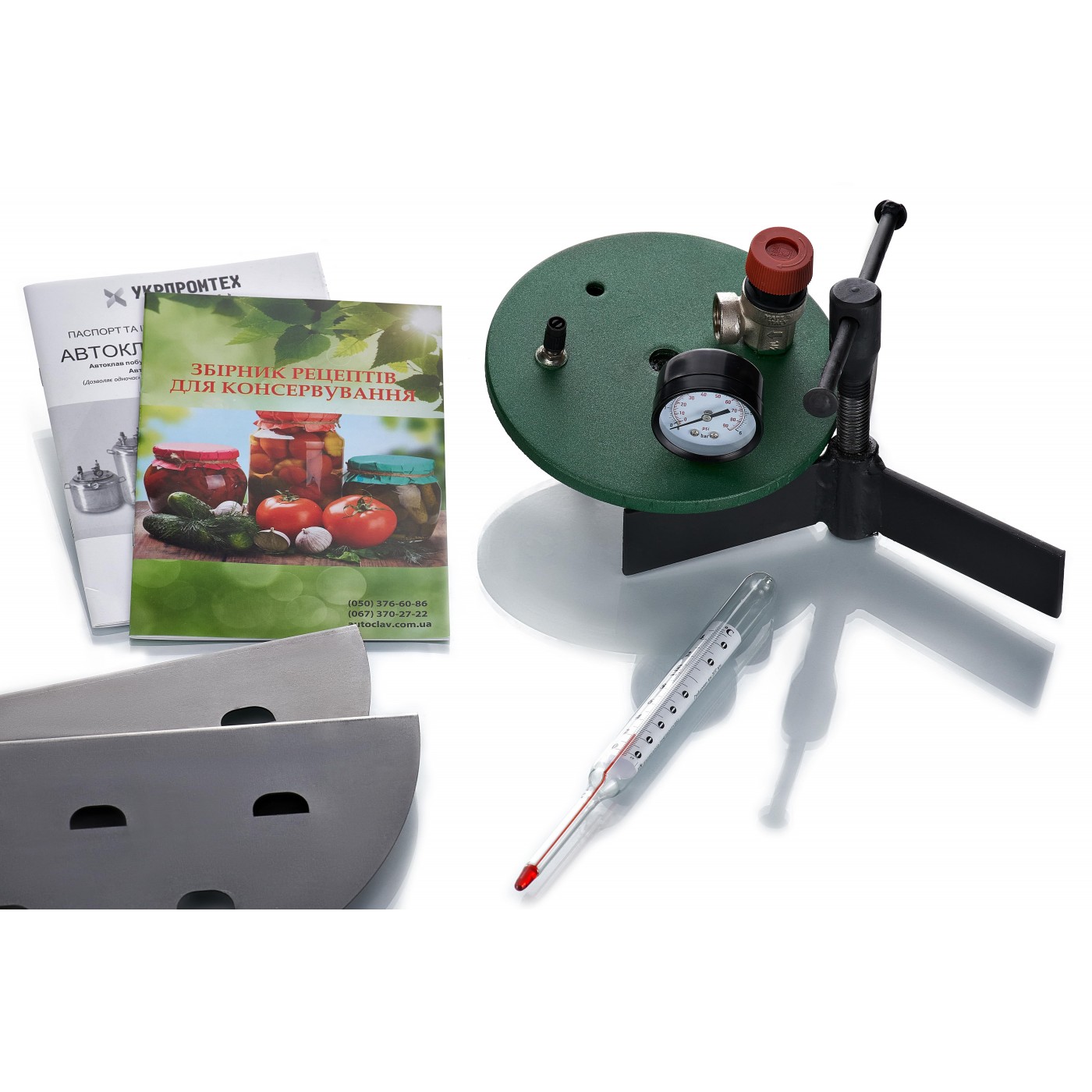 Автоклав, аварийный клапан, термометр, манометр, кран-ниппель, паспорт-инструкция, книга рецептов, гарантийный талон.