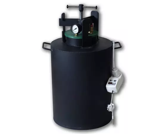 Автоклав может нагреваться как от электросети так и от внешнего источника тепла, что делает его универсальным устройством. Агрегат укомплектован блоком управления, что позволяет устанавливать необходимую температуру и время для готовки в автоматическом режиме. За безопасность во время автоклавирования отвечает специальный аварийный клапан.