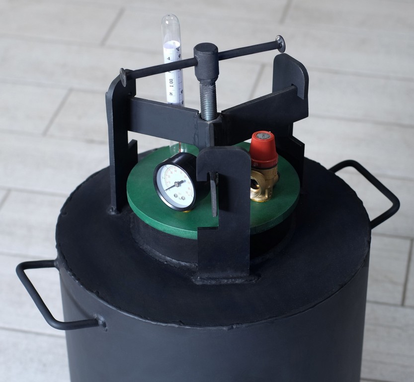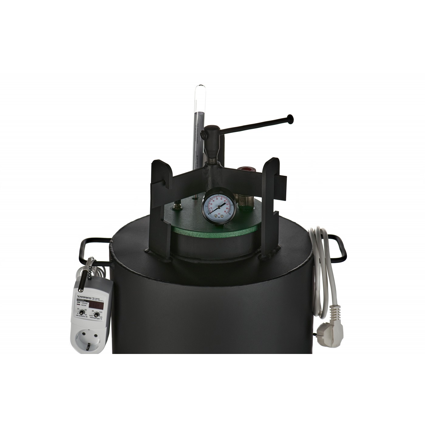 Автоклав может нагреваться как от электросети так и от внешнего источника тепла, что делает его универсальным устройством. Агрегат укомплектован блоком управления, что позволяет устанавливать необходимую температуру и время для готовки в автоматическом режиме. За безопасность во время автоклавирования отвечает специальный аварийный клапан.