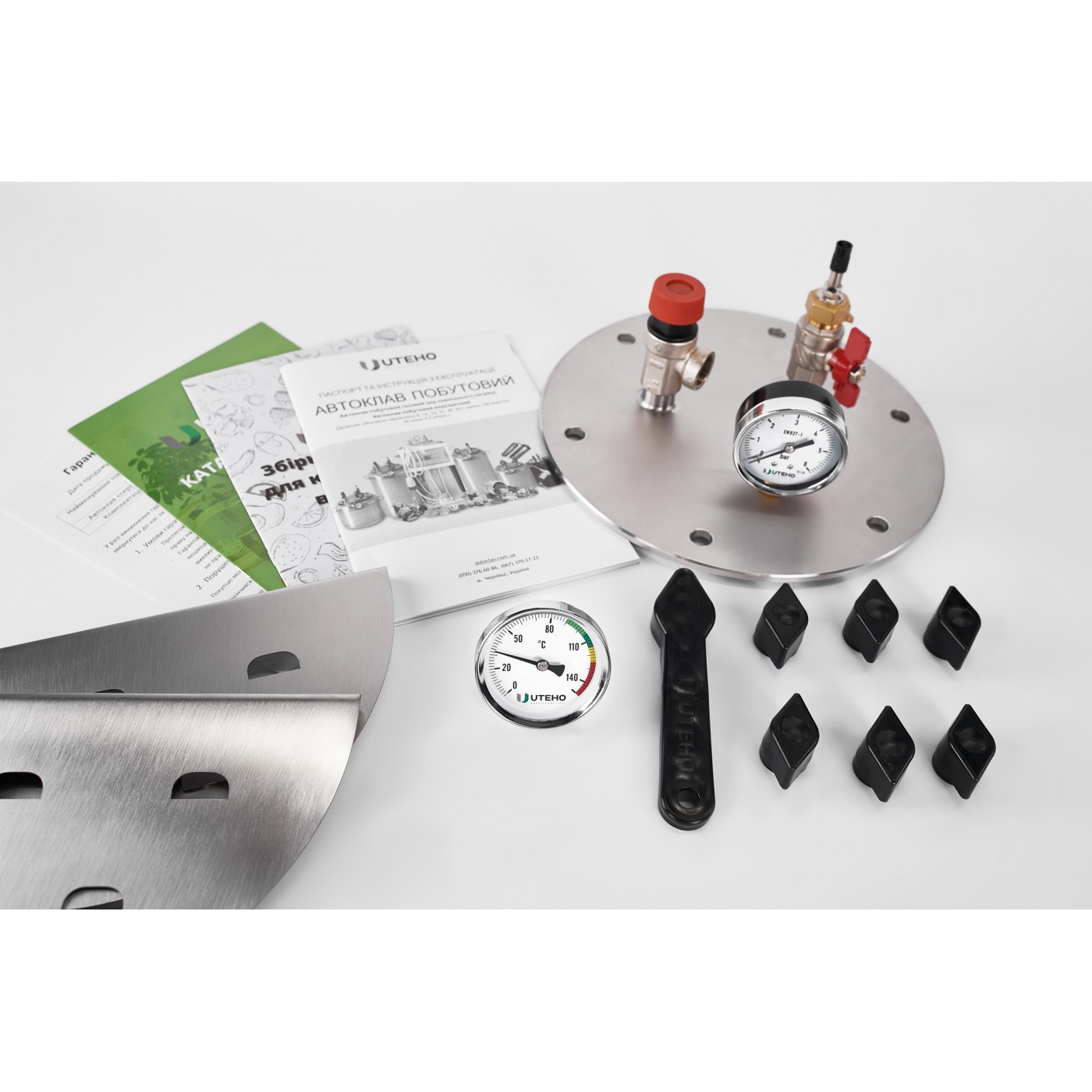 Автоклав, аварийный клапан, термометр, манометр, кран-ниппель, паспорт-инструкция, книга рецептов, гарантийный талон.