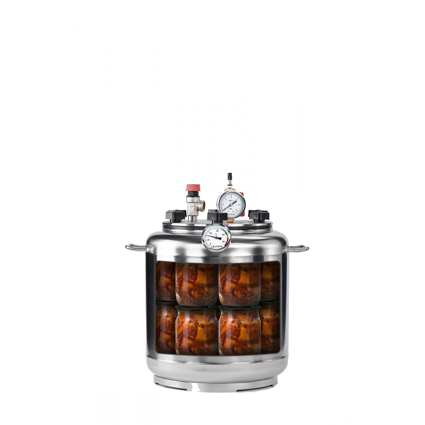 Камера стерилизации данной модели вмещает 16 банок объемом 0.5 литра, так же можно загружать и банки объемом 1 и 2 литра, что дает возможность варьировать объем загружаемой продукции. Вес аппарата всего 10 кг., что дает возможность легко справится с ним без посторонней помощи.